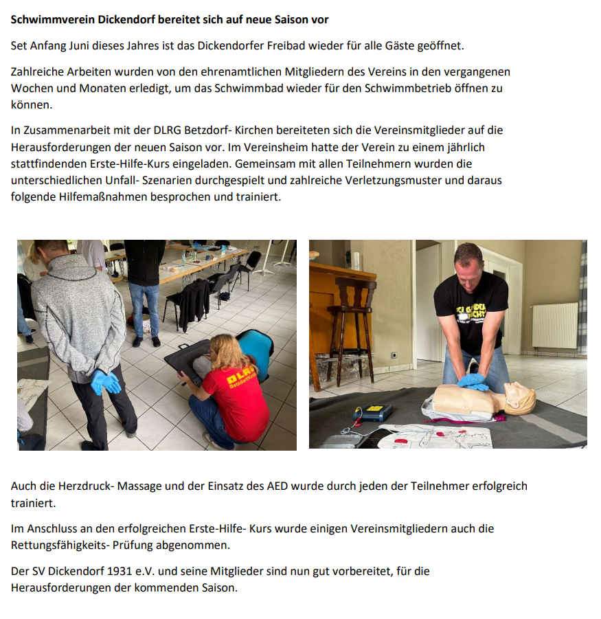 Mit viel Engagement starten die Mitglieder des SV Dickendorf in die Vorbereitungen für die neue Saison. Bereits frühzeitiger als in den vergangenen Jahren haben die Mitglieder die Frühjahrsarbeiten begonnen und treffen alle Vorbereitungen für einen pünktlichen Start in die Sommersaison 2024.