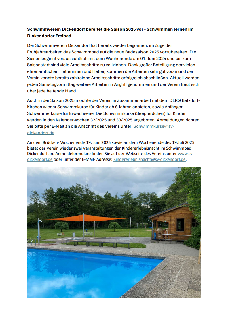 Mit viel Engagement starten die Mitglieder des SV Dickendorf in die Vorbereitungen für die neue Saison. Bereits frühzeitiger als in den vergangenen Jahren haben die Mitglieder die Frühjahrsarbeiten begonnen und treffen alle Vorbereitungen für einen pünktlichen Start in die Sommersaison 2024.
